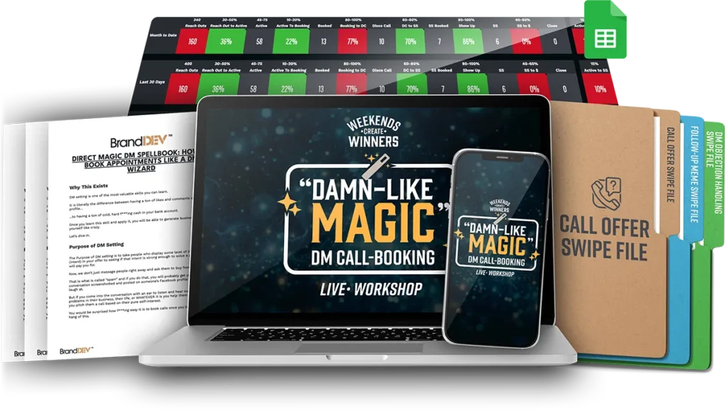 And get replay access to 90-minutes of hands-on instruction PLUS setting scripts, world-class sales dashboard, SOPs, swipe files for call offers, objection handles, and follow-up memes, and more!